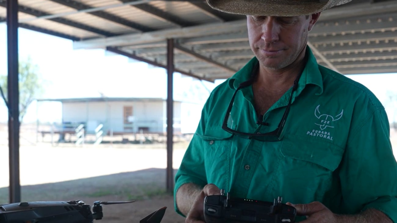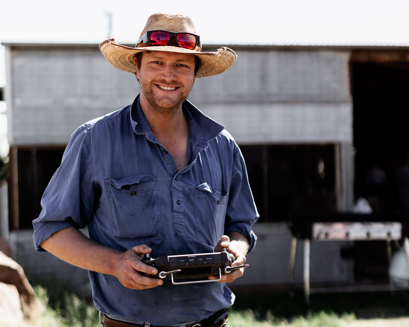 Ethan Manns, demonstrating his drone mustering skills and new technology on his family farm, Dijoe Station during the Resilient Farming Field-day. |